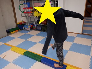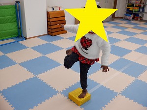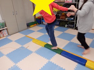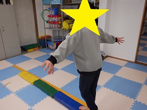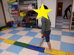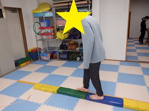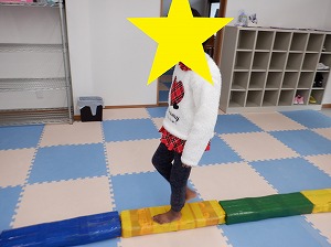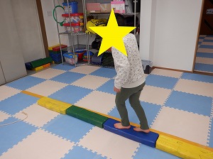 平均台の上に乗って、両腕を広げ、片足をあげてバランスを取りましょう!