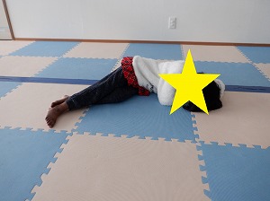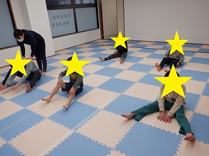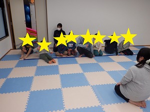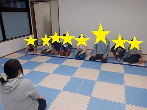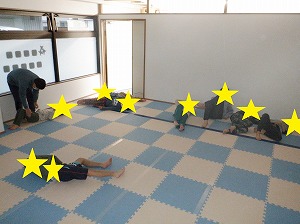 水分補給後は床に寝ころび、呼吸を整えて「動から静への切り替え練習」を行いました。