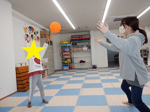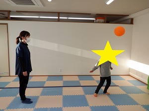 風船を床に落とさないように先生と一緒にポンポンします❣
