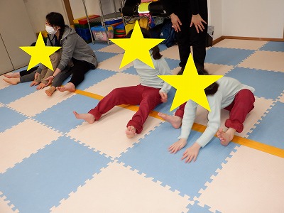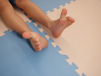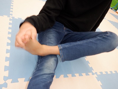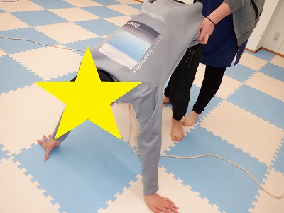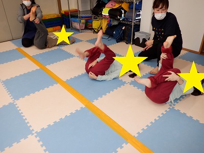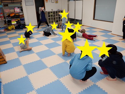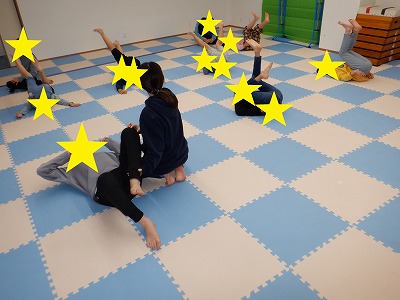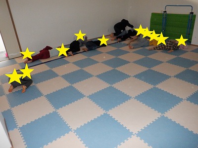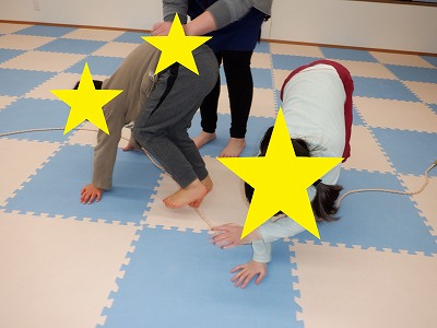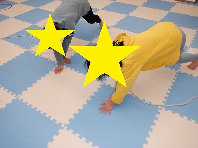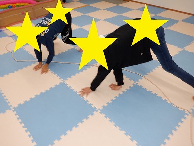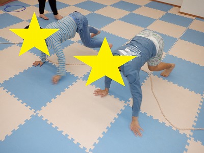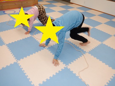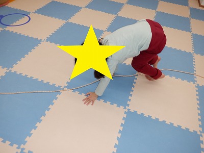 クマさんで横移動は縄の上をクマ歩きの状態で横歩きで進みます。縄に触れないようにしながら手をしっかりパーにして、腰を上げて進みます。