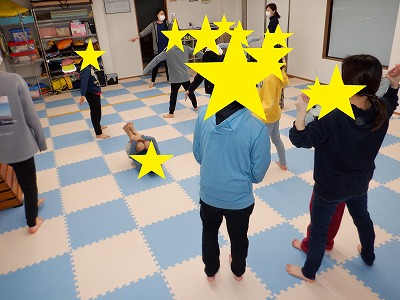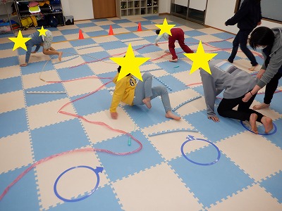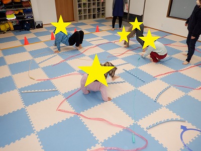 クマの横歩き又はクモ歩きで手と足と腰などが縄やスズランテープに当たらないように進み、ゴール地点のコーンにタッチできたらクリアです。