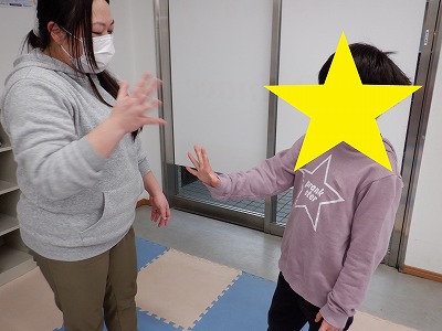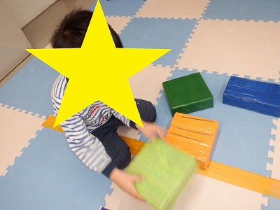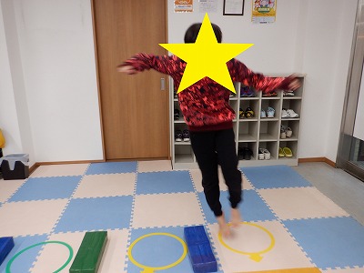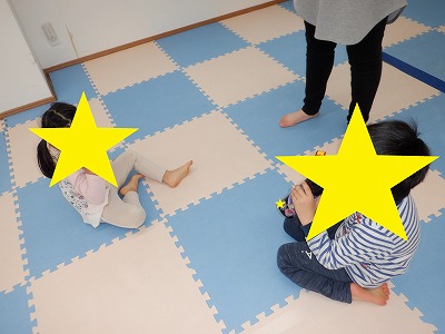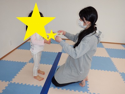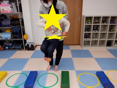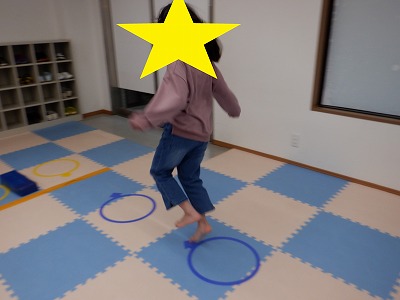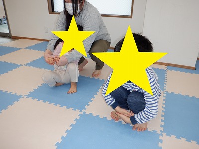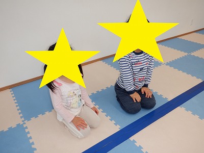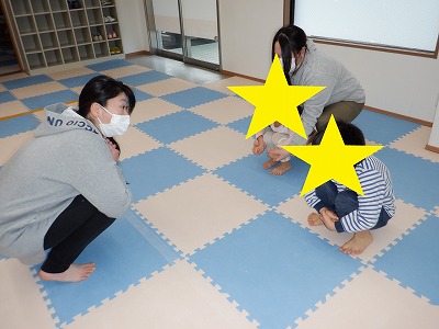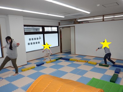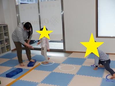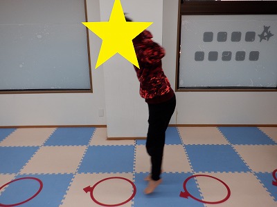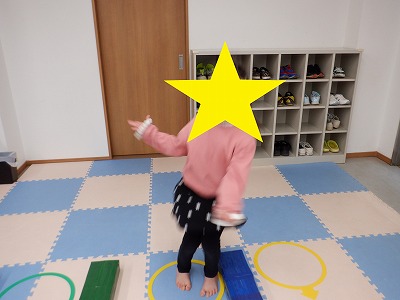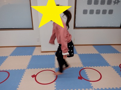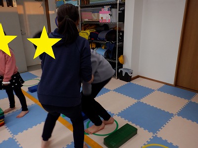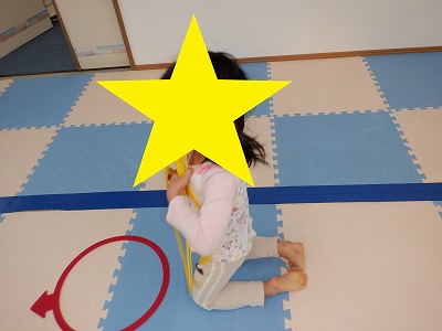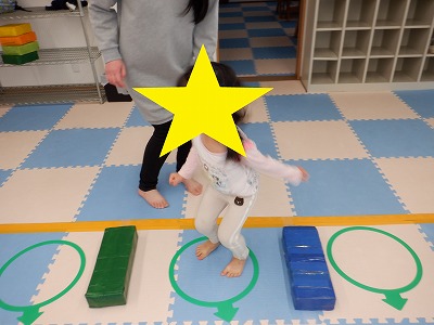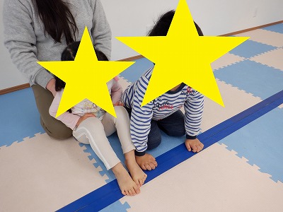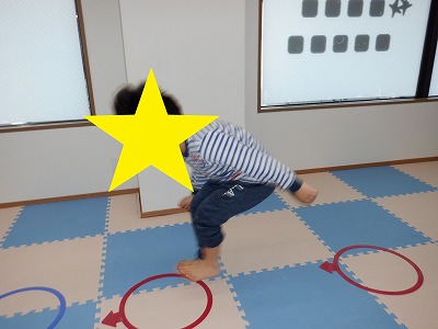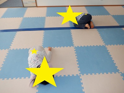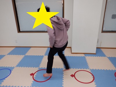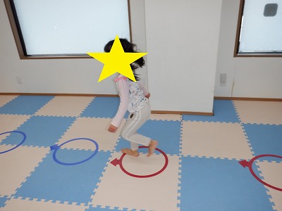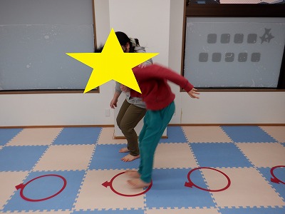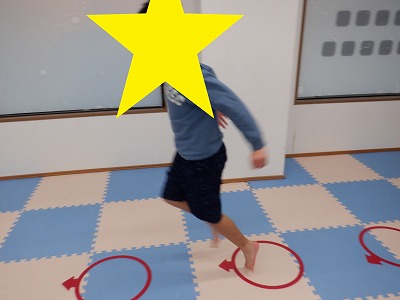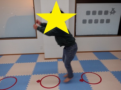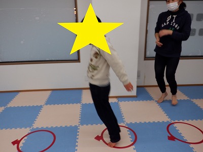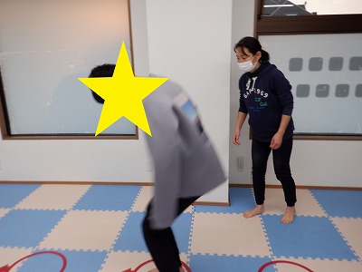 〇×ゲームを全身を使って行います。お友達とぶつからないように間隔を取り準備万端です。