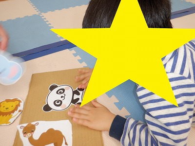 工作では、段ボールに動物のプリントを貼り付けてハサミで切り取りました♪