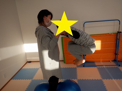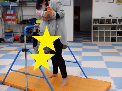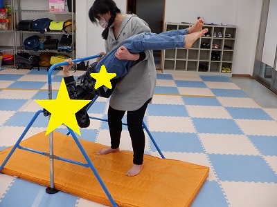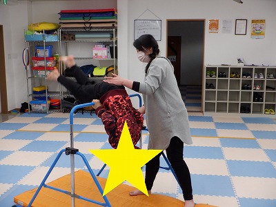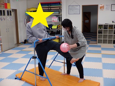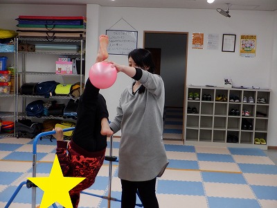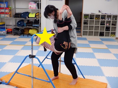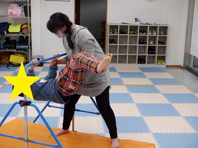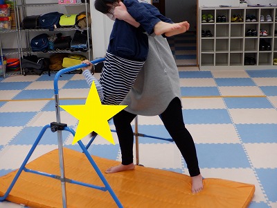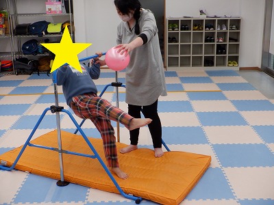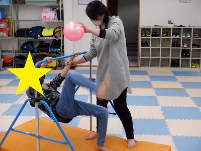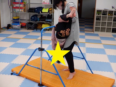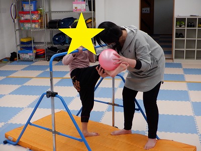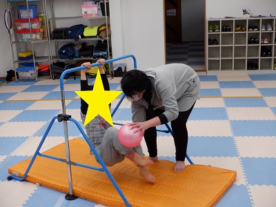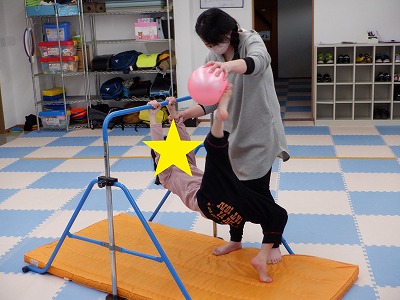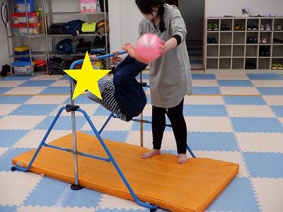 鉄棒を逆手で掴み、肘を曲げたまま職員が持っているボールをキックしましょう。