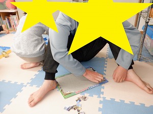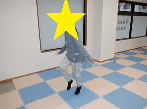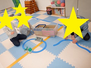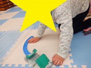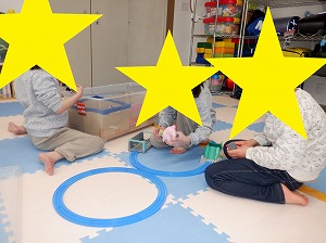 自由遊びの時間では、プラレールで長い線路を作って遊んだり縄跳びをして
