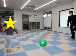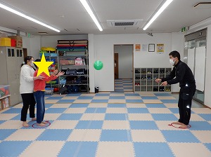 お友達や先生と向き合って、相手に届くように考えながらパスする練習です。