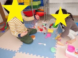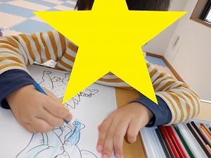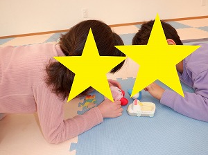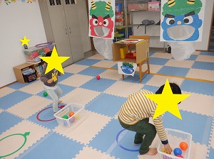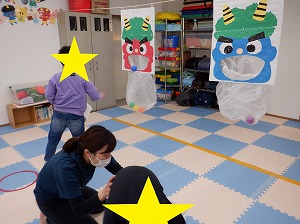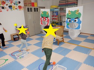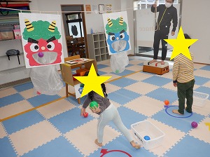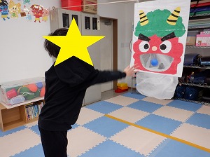 今日は鬼退治のボール投げが楽しかったお友達は引き続き鬼退治を実施したり、おままごと、塗り絵、点つなぎなどで遊びました。