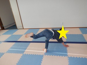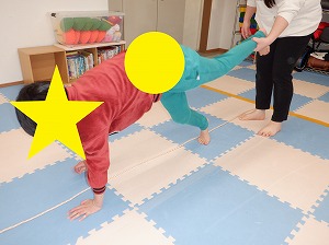 支持力を養います。自分の体を腕の力で支える練習です。片足が上がっているので難易度は高めです!