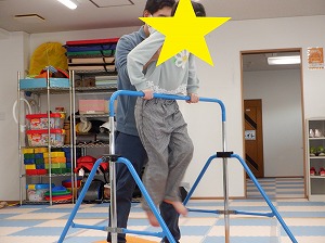 鉄棒を肩幅で握って自分の体を支えました。腕を伸ばした状態をキープするのは大変ですが、さらに足を回転させるという動きも上手に出来ていました。