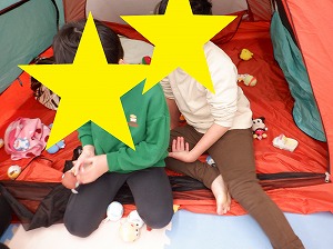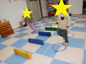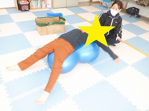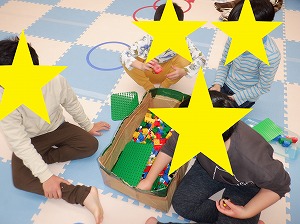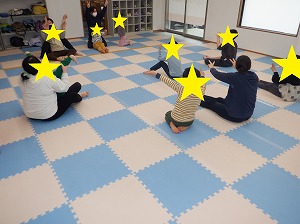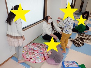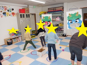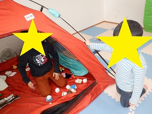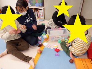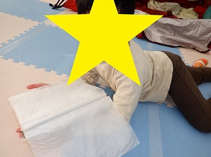 自由遊びの時間では、テントを出してぬいぐるみと一緒にリラックスタイムや、バランスボール、ペーパークラフト、シャボン玉などで遊びました。