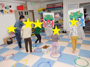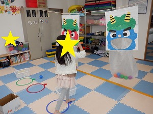 大きく後ろから振りかぶって鬼の口にボールを投げ入れます。
