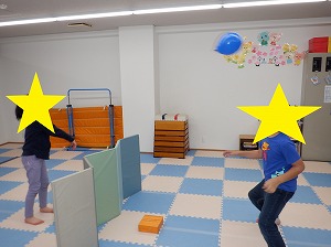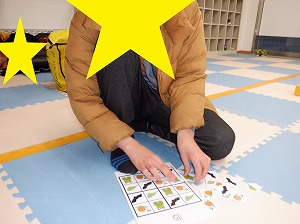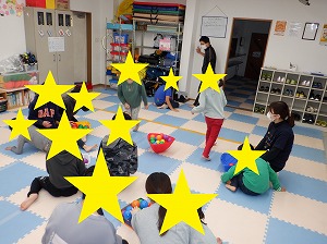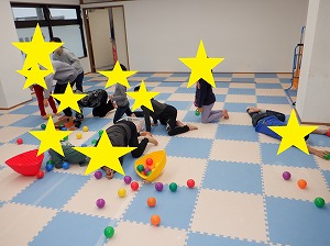 だるまさんがころんだ方式で、ストップ&スタートの練習をしました。鬼が見ていない時は動く事が出来るので、自分の近くにあるボールを拾って箱の中に入れます。