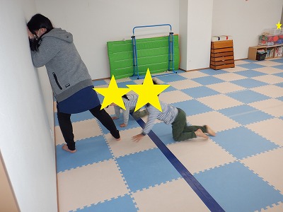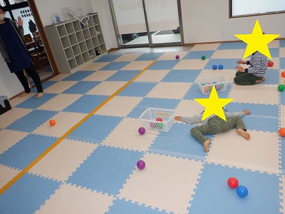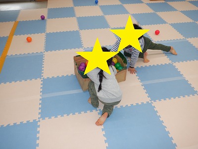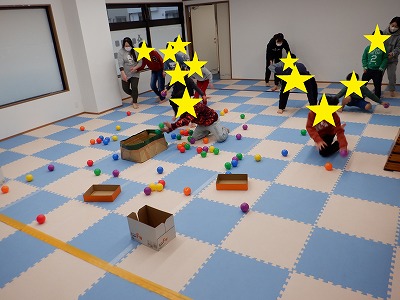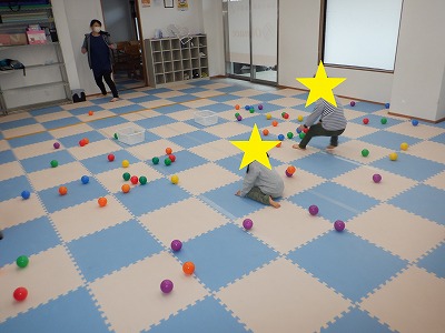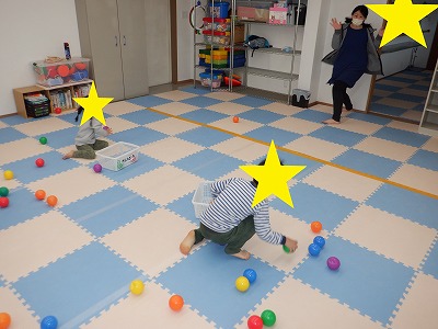 だるまさんがころんだをしながら、部屋中に転がったボールをカゴに入れます。