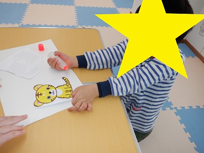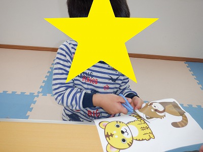 自由遊びの時間ではおままごとやだるまさんがころんだ等で遊びました。ハサミで動物のイラストを上手に切って、貼り絵もしました。