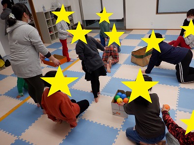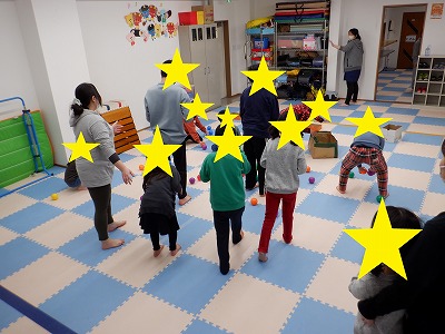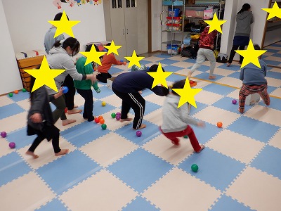 鬼さんが「だるまさんがころんだ」と言っている間に、鬼ではないお友達はボールを拾ってカゴに入れます。鬼さんが見ている時は止まります。