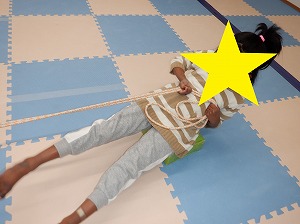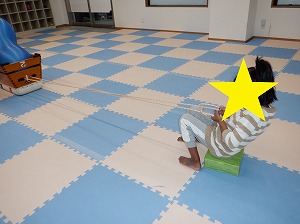平均台の上に座り、縄を引っ張って手繰り寄せます。