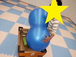 跳び箱の上段に、長縄を結びつけバランスボールを乗せます。