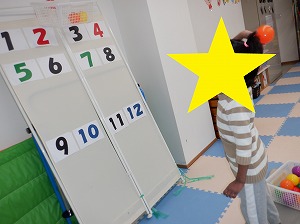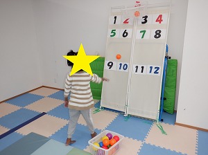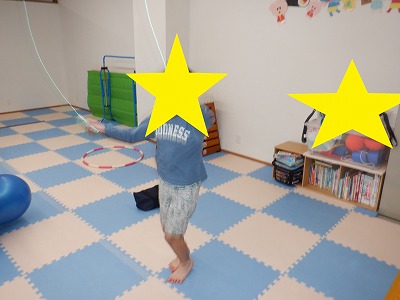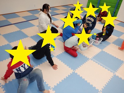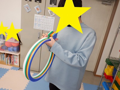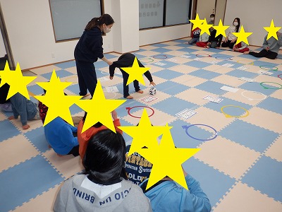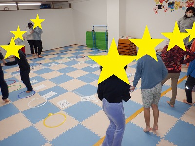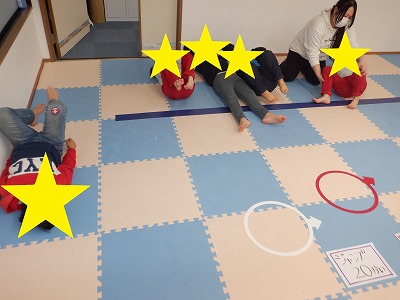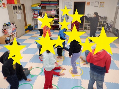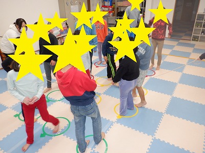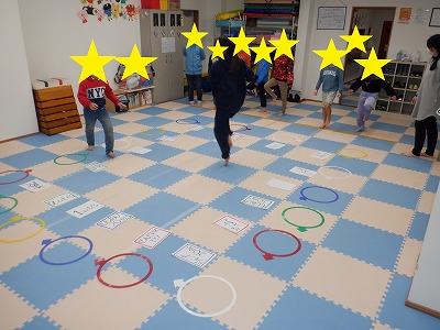 フープを円形で並べて、すごろく遊びを行いました。サイコロを投げて、出た数だけフープを進みます。フープにはお題が置かれているので、お題を行いながら進みます。お題は、もも上げや自転車漕ぎやジャンケンなどがあります。