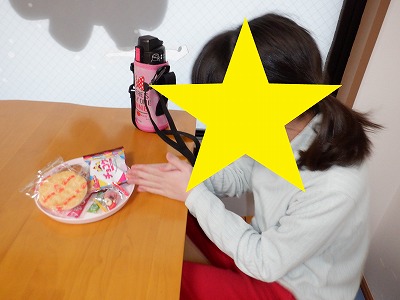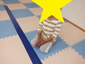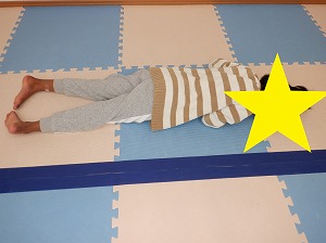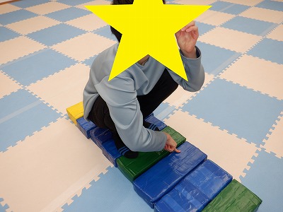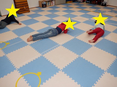 ワニさん歩きで、お菓子カードが置いてあるところまで進みます。辿り着いたら好きなカードを持ってワニさん歩きでスタート地点に戻ります。