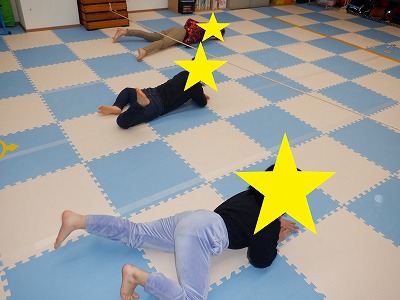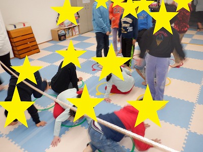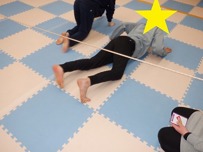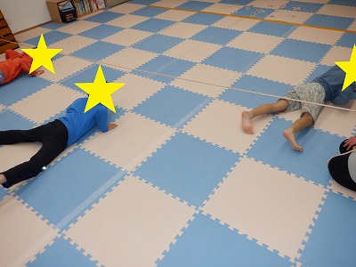 職員が長縄を持ち、顔の高さや床ギリギリの高さで走り抜けます。お友達は縄に引っかからないようにタイミングよく、しゃがんだり、跳んで避けてください。空間認知力、瞬発力を養います。