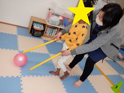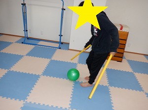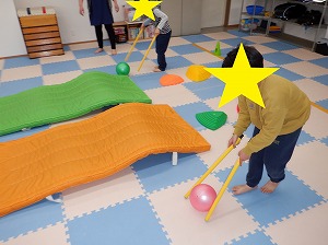 ボール転がしは、2本の棒でボールをコントロールしながら転がしましょう。