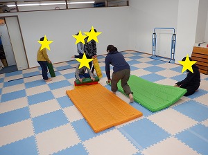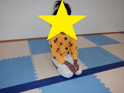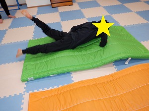 マットの下に平均台を入れて、凸凹の状態します。その上をワニさん歩きで乗り越えます。凸凹だと歩きにくくなっています。