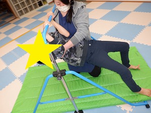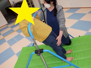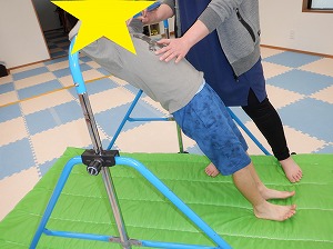 床に足を付けたまま鉄棒をしっかり握って体を斜めにします。