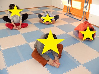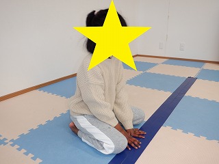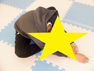 マットに手を付いたまま、足はフープからマットへと縄を飛び越しジャンプをします。