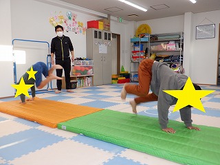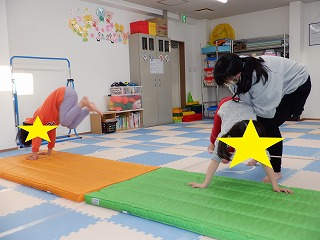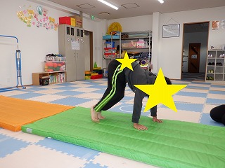 足を出来るだけ高く上げることで側転の練習に繋がりますね!