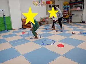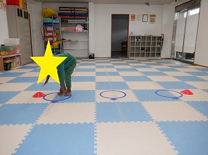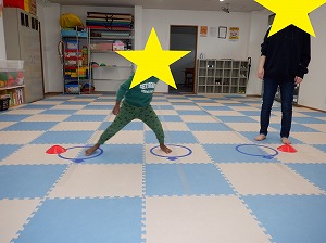 リズム良く横跳びで跳んでカップにタッチ❣