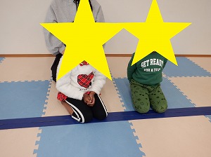 足を大きく開いて足の間からお友達とジャンケンポン❣