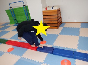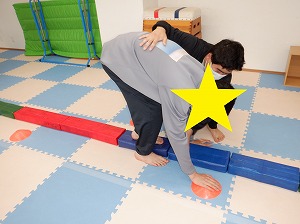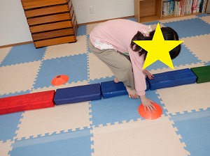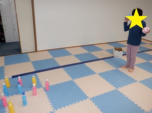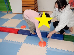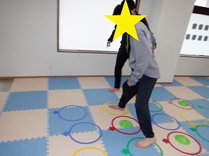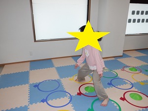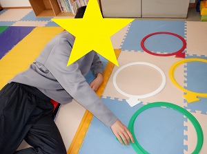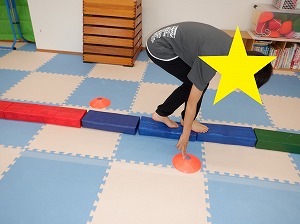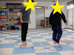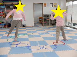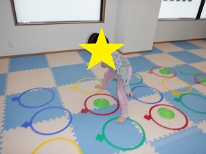 フープの中にカップがおいてある部分は踏まないようにジャンプで避けていきます。