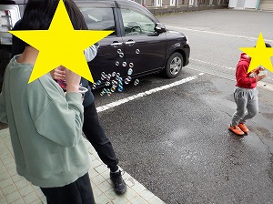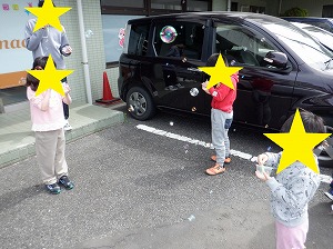自由遊びは、パズルやぬいぐるみ、フラフープなどで遊びました。シャボン玉とお水遊びも楽しかったね!
