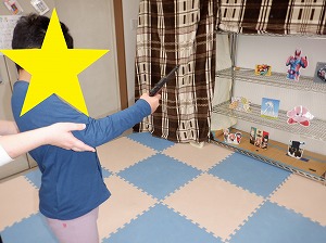 足元や頭上、お腹の部分に黄色いスポンジ剣が通過します。