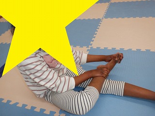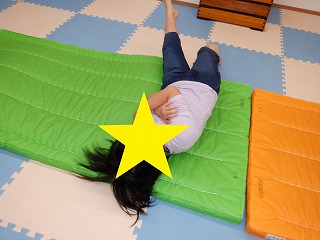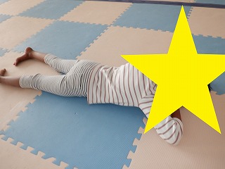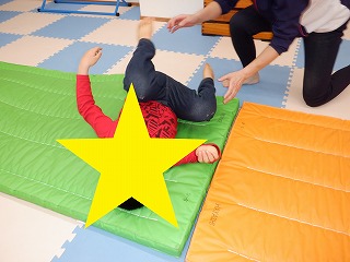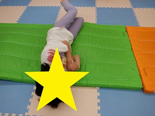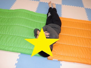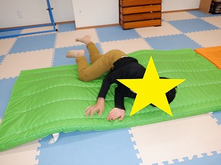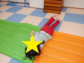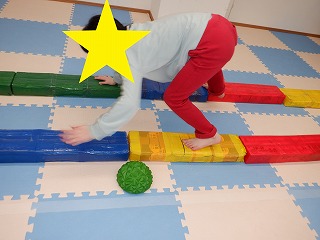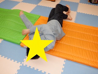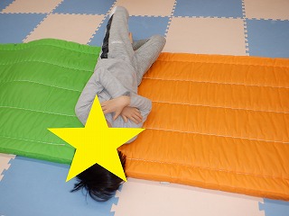 ゴロゴロいも虫は、マットの下に平均台が置かれてデコボコして少し転がりにくくなっています。デコボコに負けず転がります。