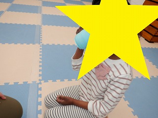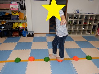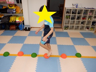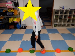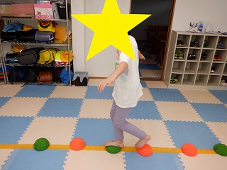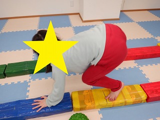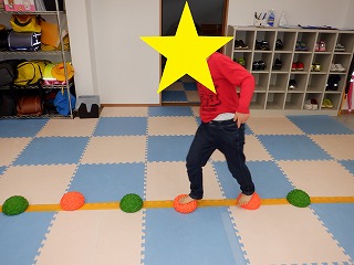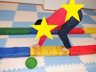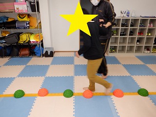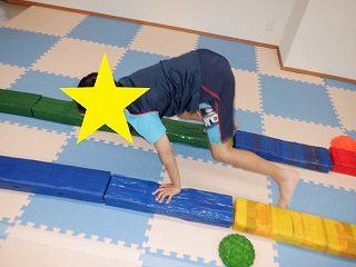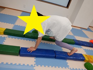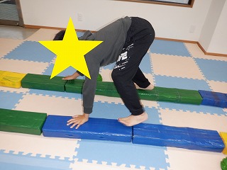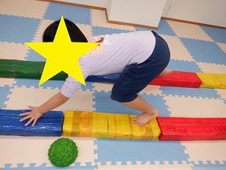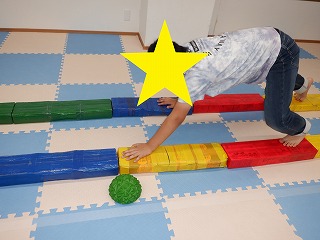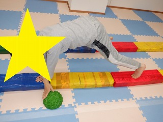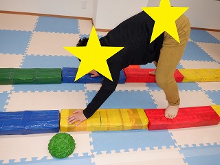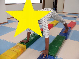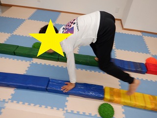 2本橋クマさんでは、平均台に横に緑とオレンジのバランスパッドが置かれています。クマさん歩きで渡りながら緑のバランスパッドだけタッチします。