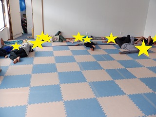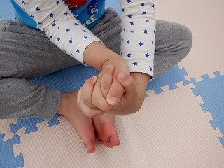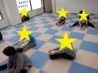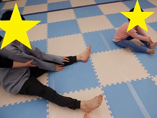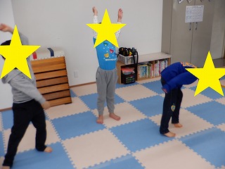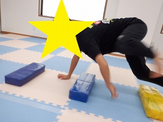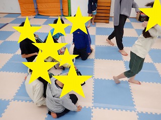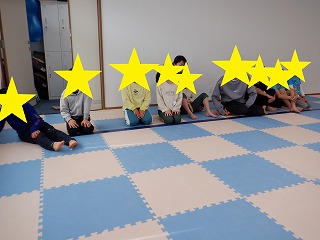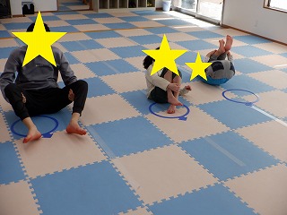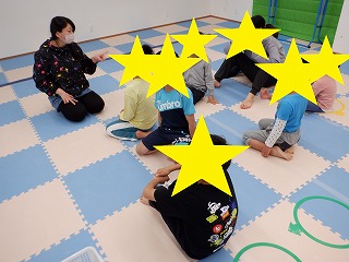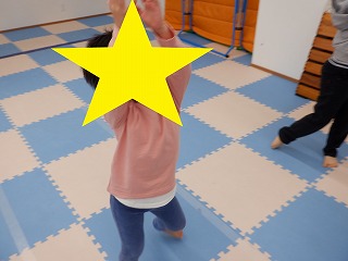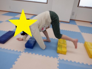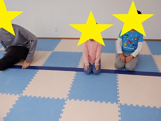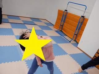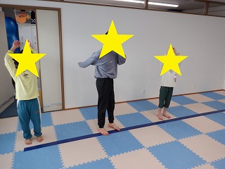 両手で足を抱えて丸くなり後ろに転がります。起き上がった後に立ち上がってポーズを決めるお友達もいました。