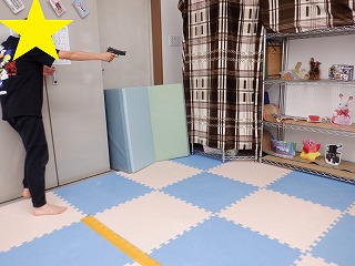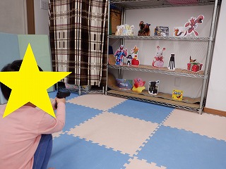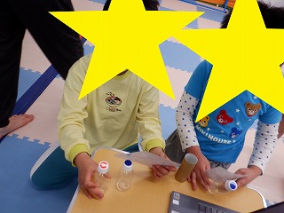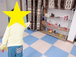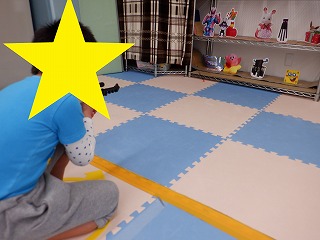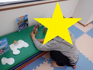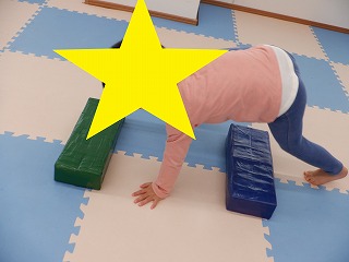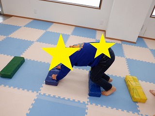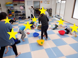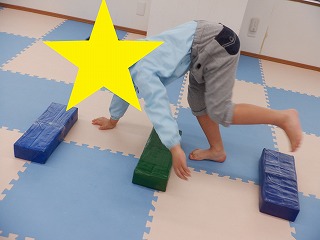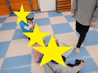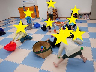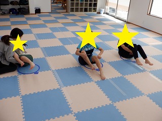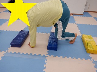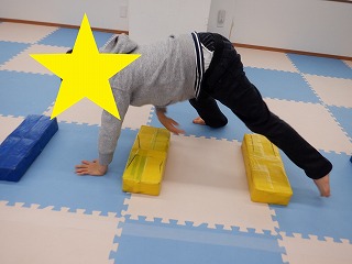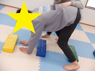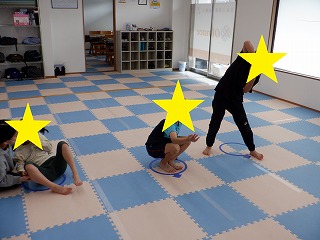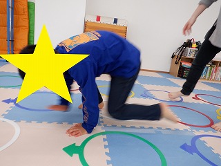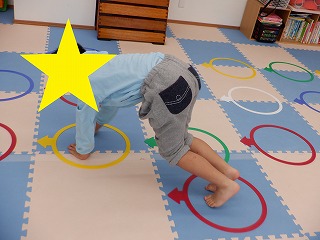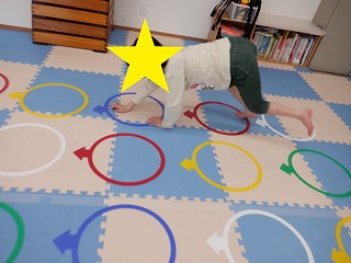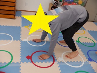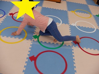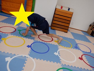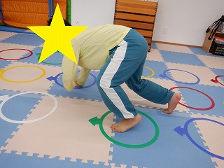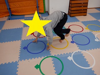 フープクマさんは、指定された色のフープを踏まないようにクマさん歩きを行います。