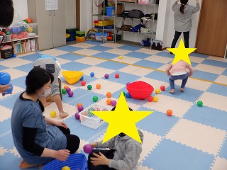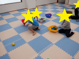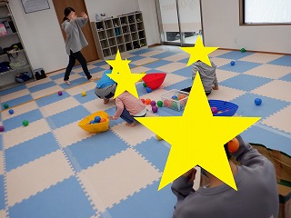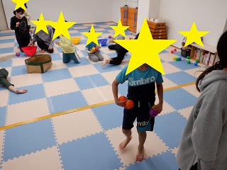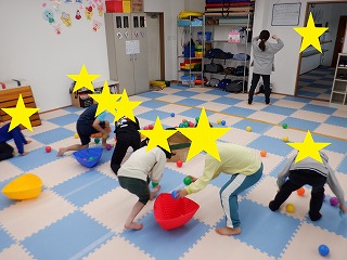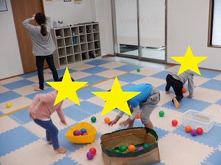 「だるまさんがころんだ」をしながらボールを拾い集めます。