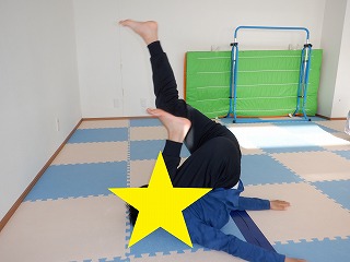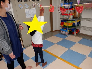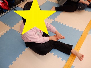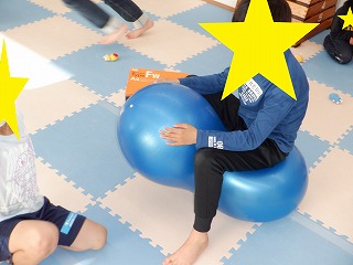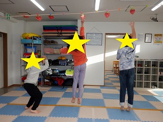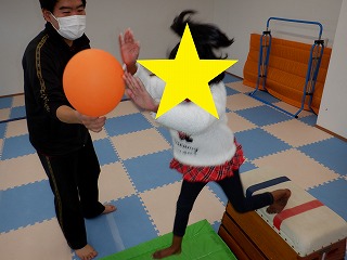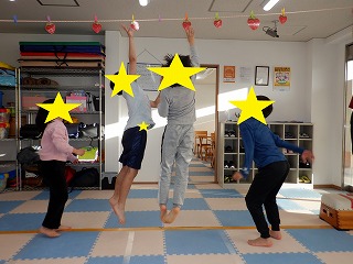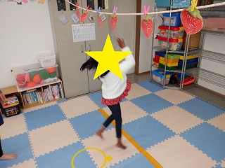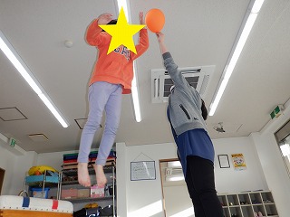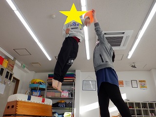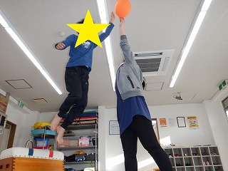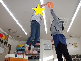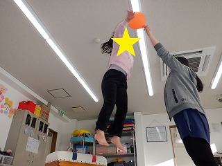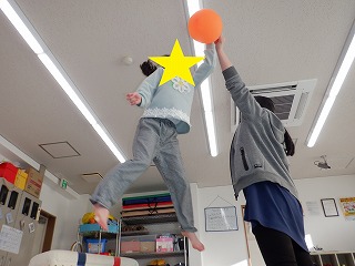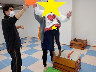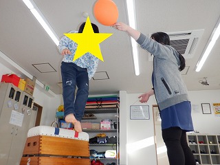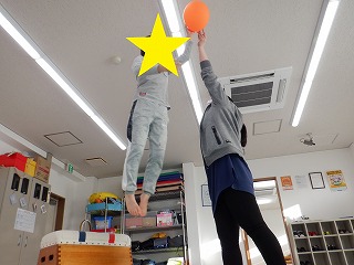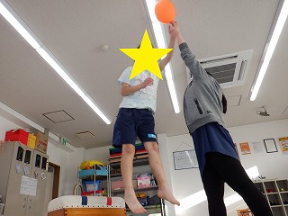 風船に向かってジャンプ!教室の天井に手が届いてしまいそうな勢いでした(*^^*)着地も膝を曲げて上手に出来たね✨