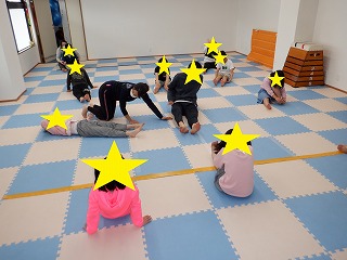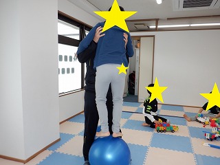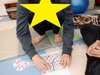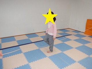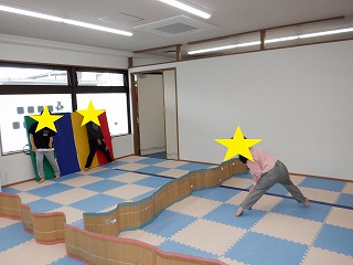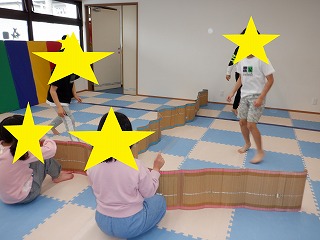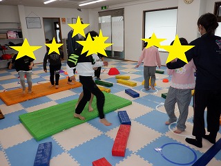 平均台・フープ・でこぼこ石等を教室中に置きます。みんなで協力してコースづくりをしました!