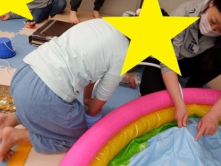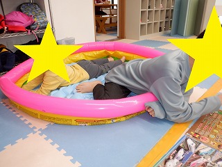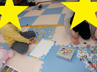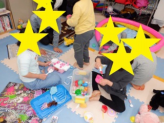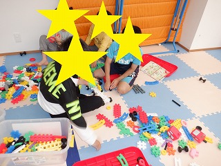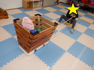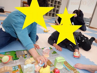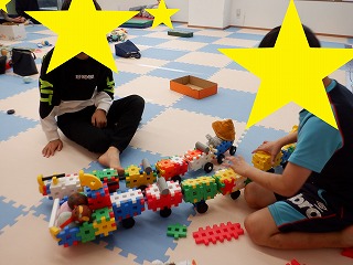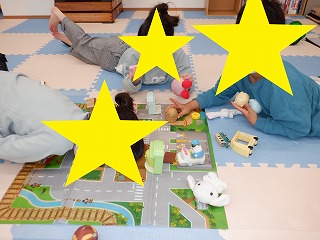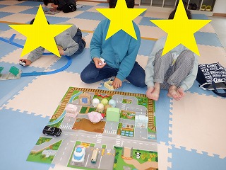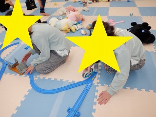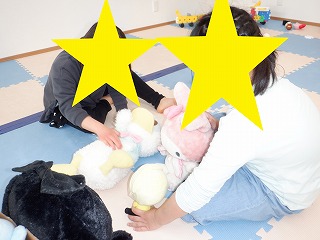 午後からの自由遊びは、ぬいぐるみ遊びやニューブロックやプラレールで遊びました。