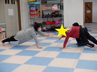 うつ伏せになり、手を胸の下につき、肘を伸ばします。足を伸ばしバランスを取ります。片手を離し、お友達とジャンケンをしましょう。