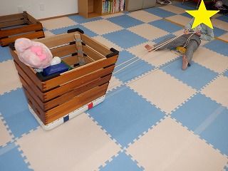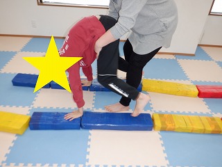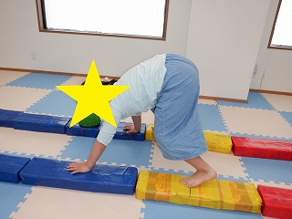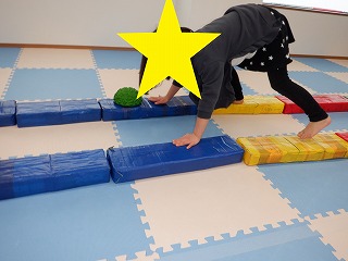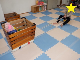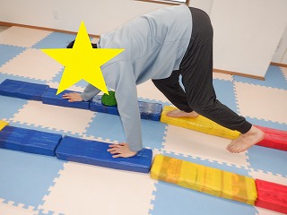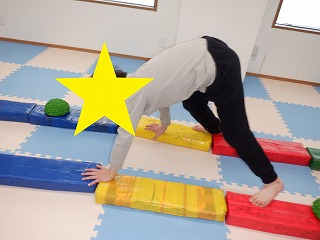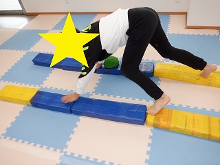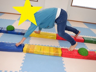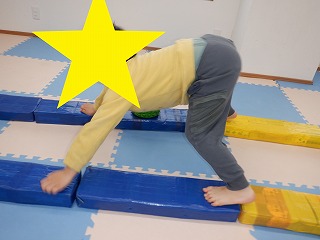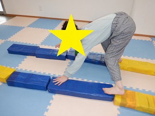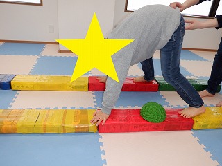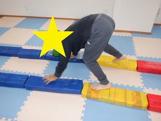 2本橋クマさんは、平均台を線路のように2列に並べ、その上をクマさん歩きで渡ります。