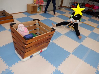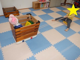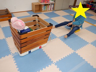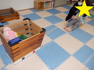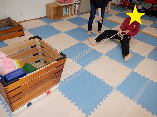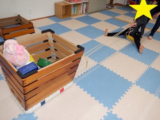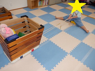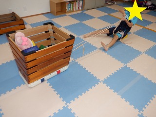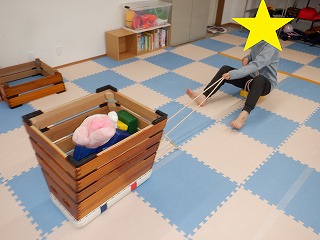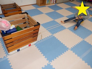 荷物運びは、平均台の上に足を開いて、座ります。その状態で腕の力だけで平均台が乗った跳び箱の上段を縄を引っ張って手繰り寄せます。