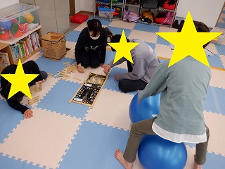 午後からの自由遊びは、パズルやバランスボール、塗り絵などで遊びました。