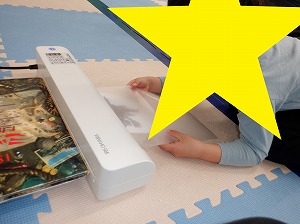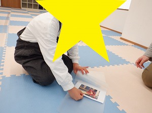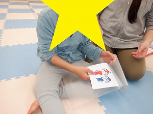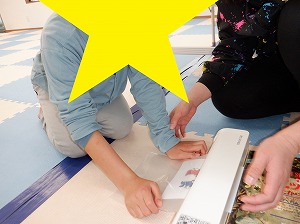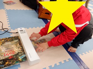 ラミネート加工体験に使うキャラクターを先生と一緒に選びながら
