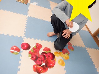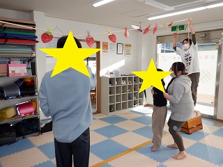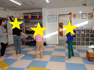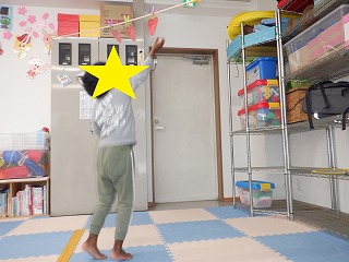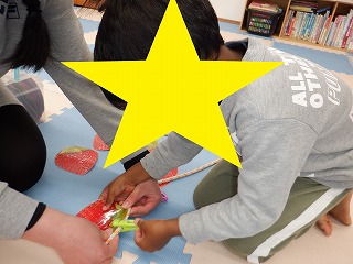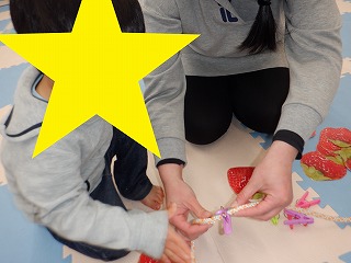運動遊びの準備も手伝ってくれました。いちご狩りジャンプのいちごをロープにクリップで止めます。