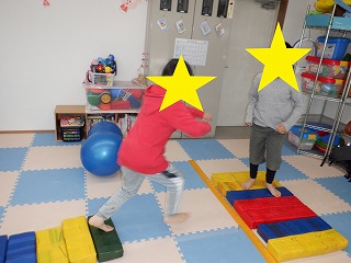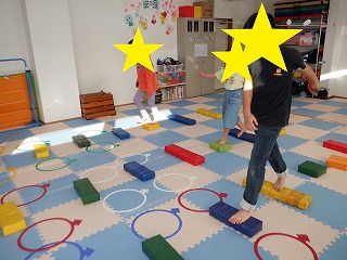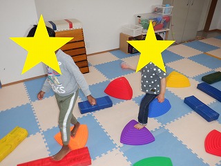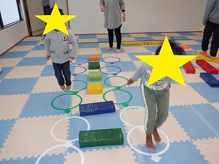 障害物渡りではでこぼこ石や平均台の上をバランスを取りながら進み、出会ったらジャンケンも行いました。