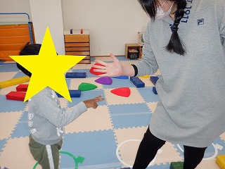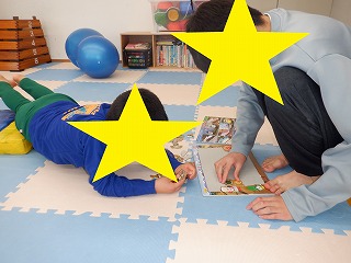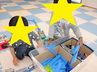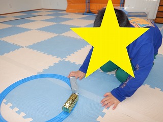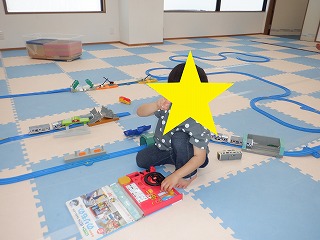 自由遊びでは、教室に全体を使ってプラレールの街を作って電車の歌絵本で音を流して遊んだり、パズルをして遊びました。